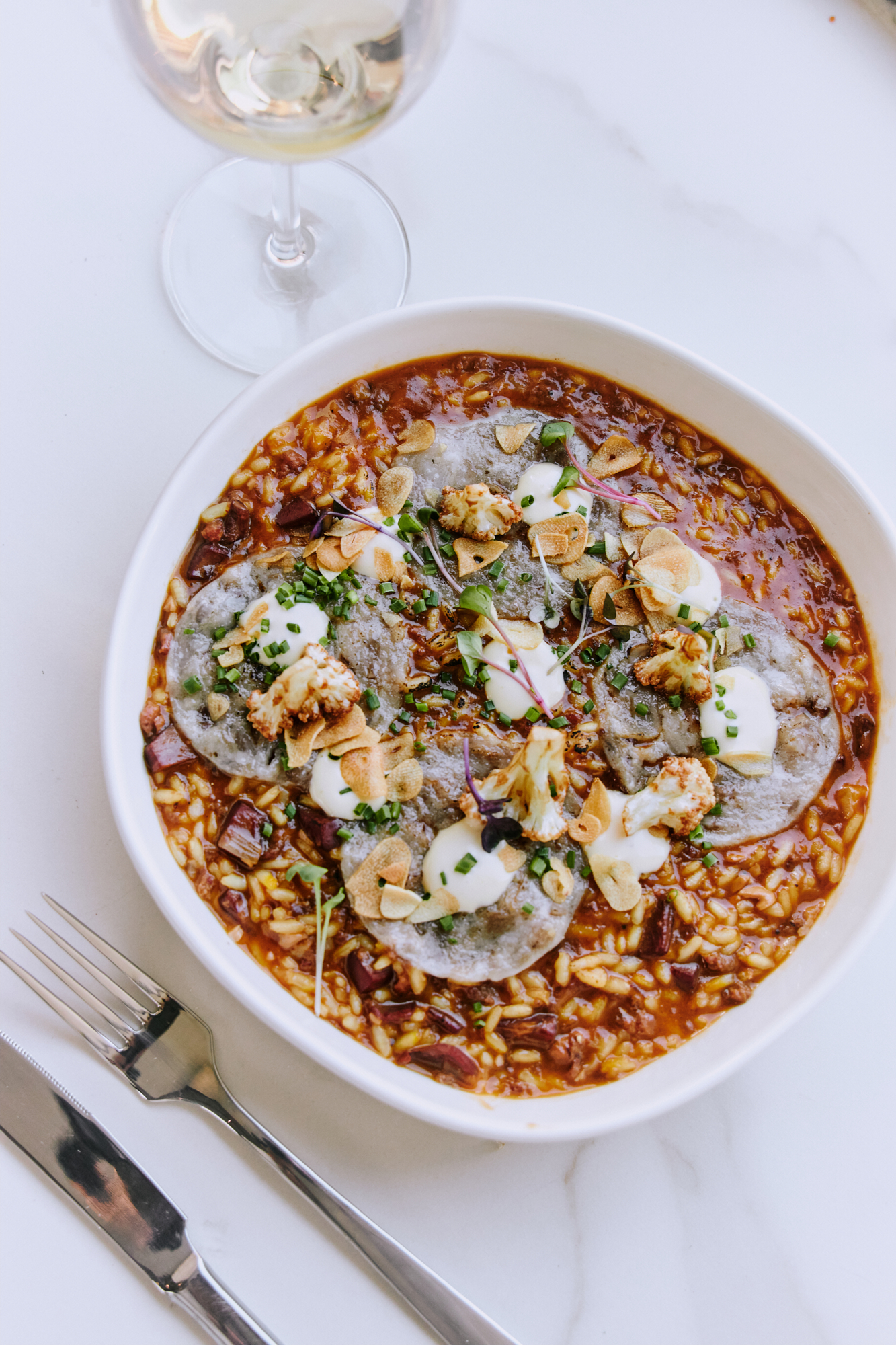 Amb safrà, calamar estofat, peus de porc i allioli de llimona.