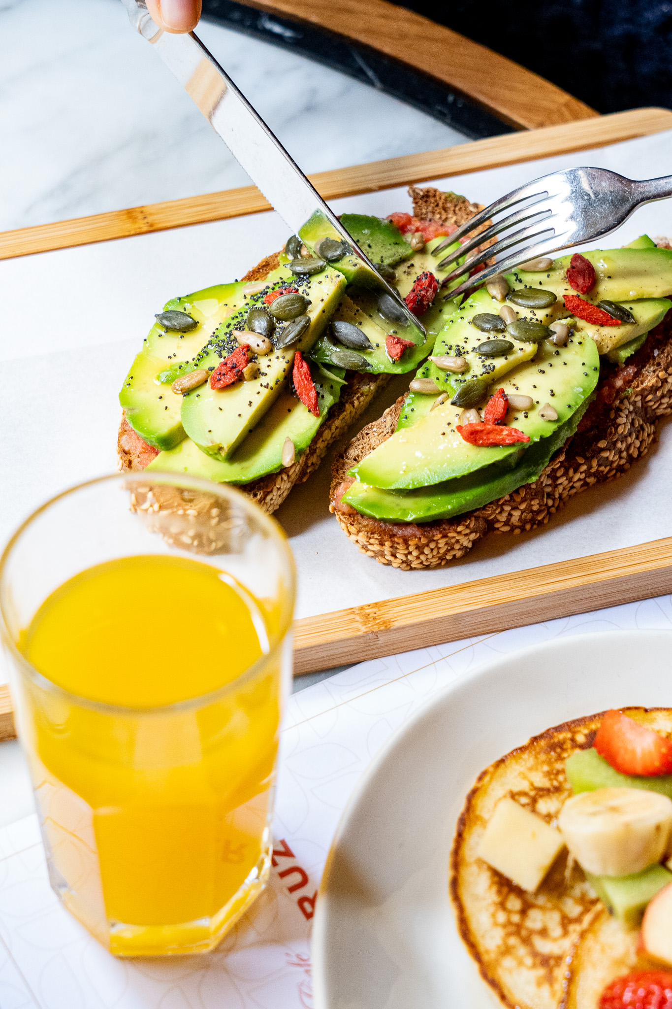 Loaf + avocado + grated tomato + seed mix + coffee + orange juiceAdditional smoked salmon +3€Additional poached egg +1.5€