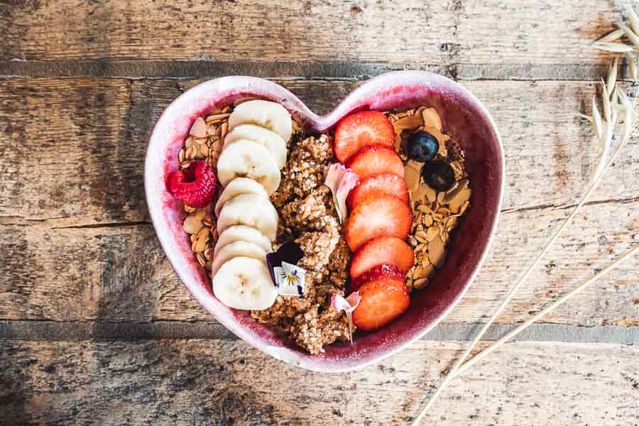 Smoothie de Frutos rojos, açai y plátano con frutas variadas y crumble de avena, trigo sarraceno y almendras