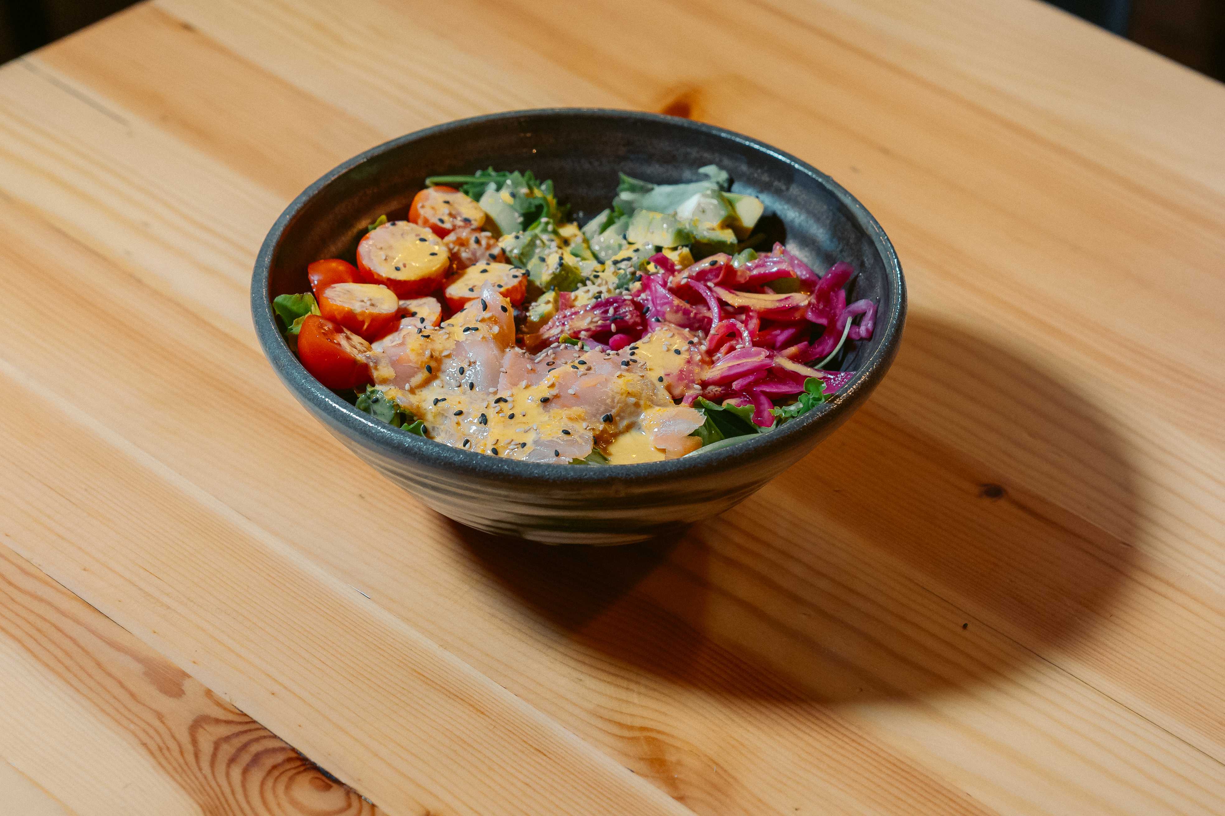Verdes, salmón ahumado, aguacate, cebolla roja encurtida, cherrys, anacardo y aderezo de vinagreta curry-miel