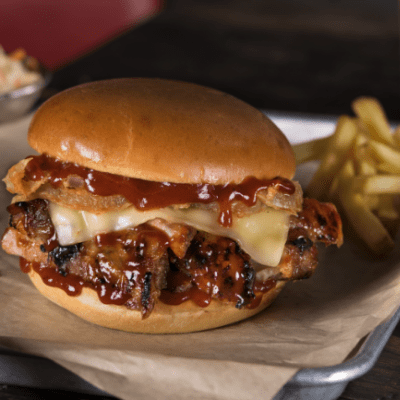 Hamburguesa hecha con un cuarto de costillar deshuesado, salsa BBQ original de Tony Roma’s, queso edam y nuestros mundialmente famosos aros de cebolla.