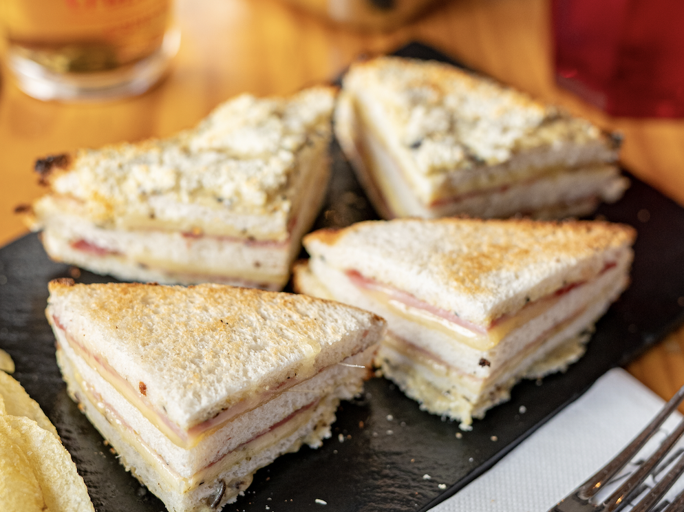 Bikini de jamón braseado con bechamel de trufa y mostaza
