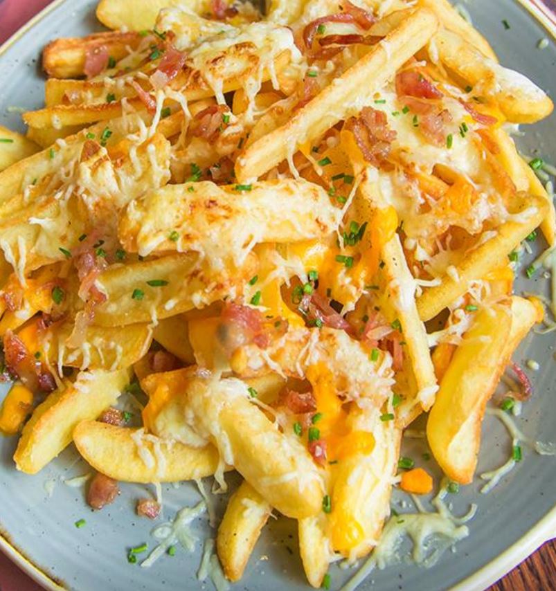 Nuestras mejores patatas fritas con salsa ranchera, trocitos de bacon y quesos gouda y cheddar.