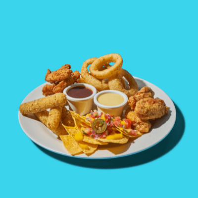 ¿No os ponéis de acuerdo? Para eso está nuestro combo. Chicken Tenders, Fresh Onion Rings, Tommy Mel´s Nachos, Mozzarella Sticks y Chicken Wings. Y para mojar salsas de mostaza dulce y barbacoa.