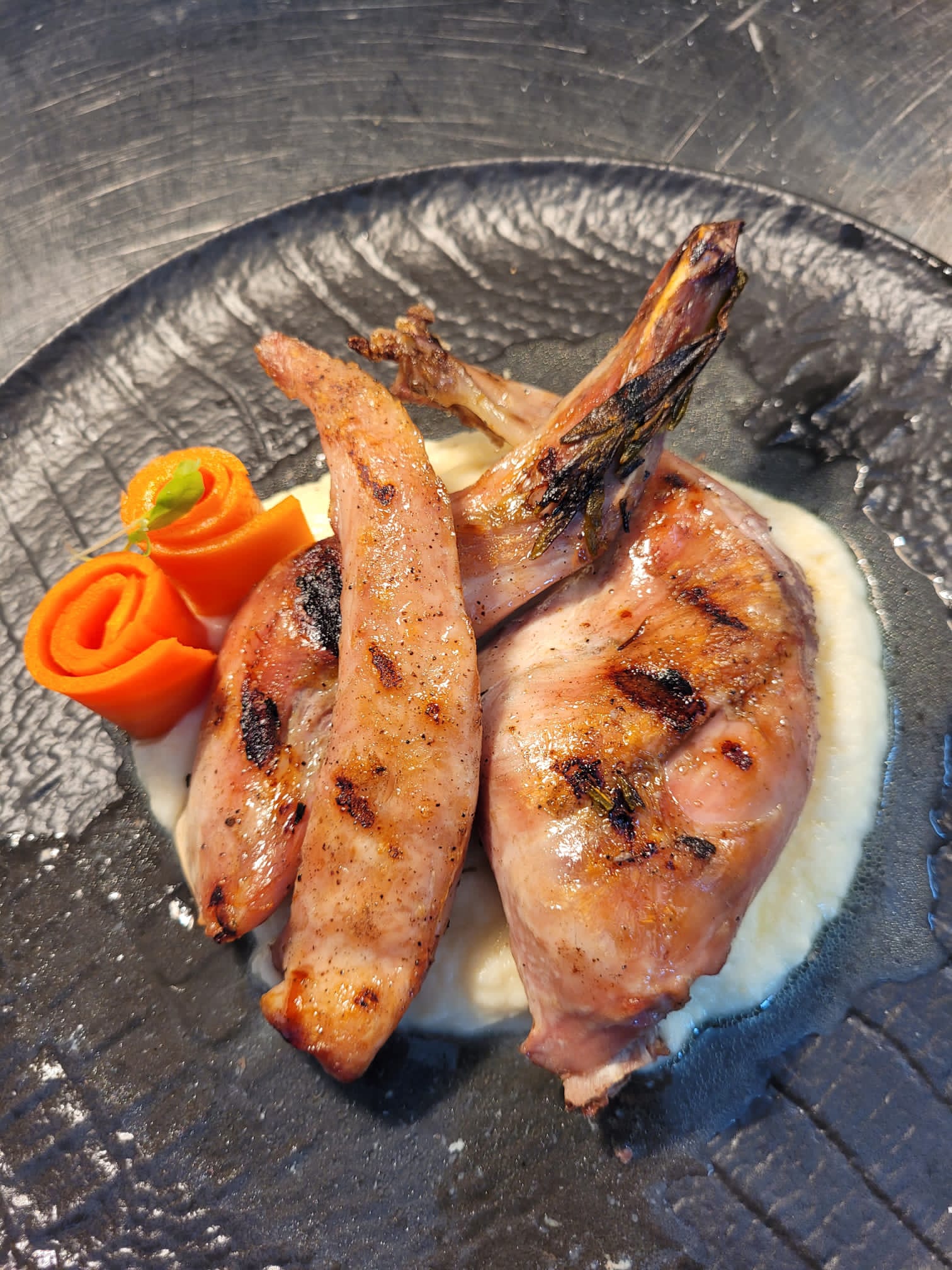 Conejo de campo cocinado a baja temperatura y terminado a la brasa de encina con puré de raíces de Invierno