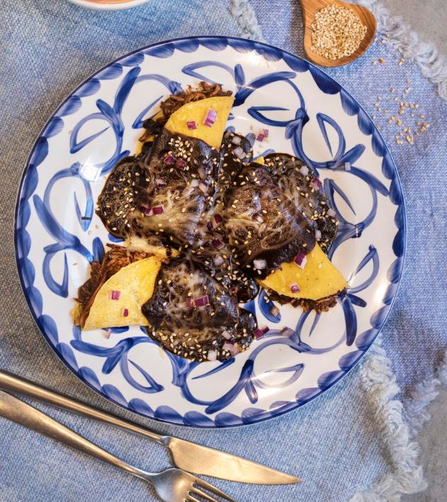 Una de las joyas de la cocina mexicana es el mole poblano con su salsa de más de 30 ingredientes incluyendo el cacao, la canela y los furtos secos, que llena de sabor estas tortillas rellenas de pollo