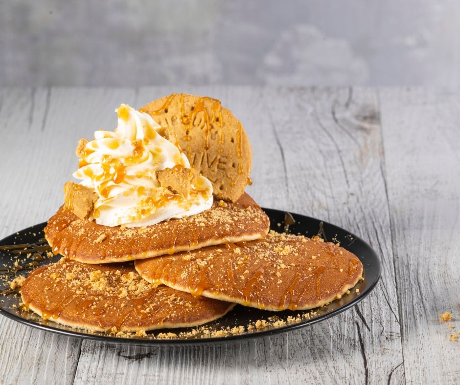 Tortitas, sirope de Lotus, nata montada y galletas Lotus.