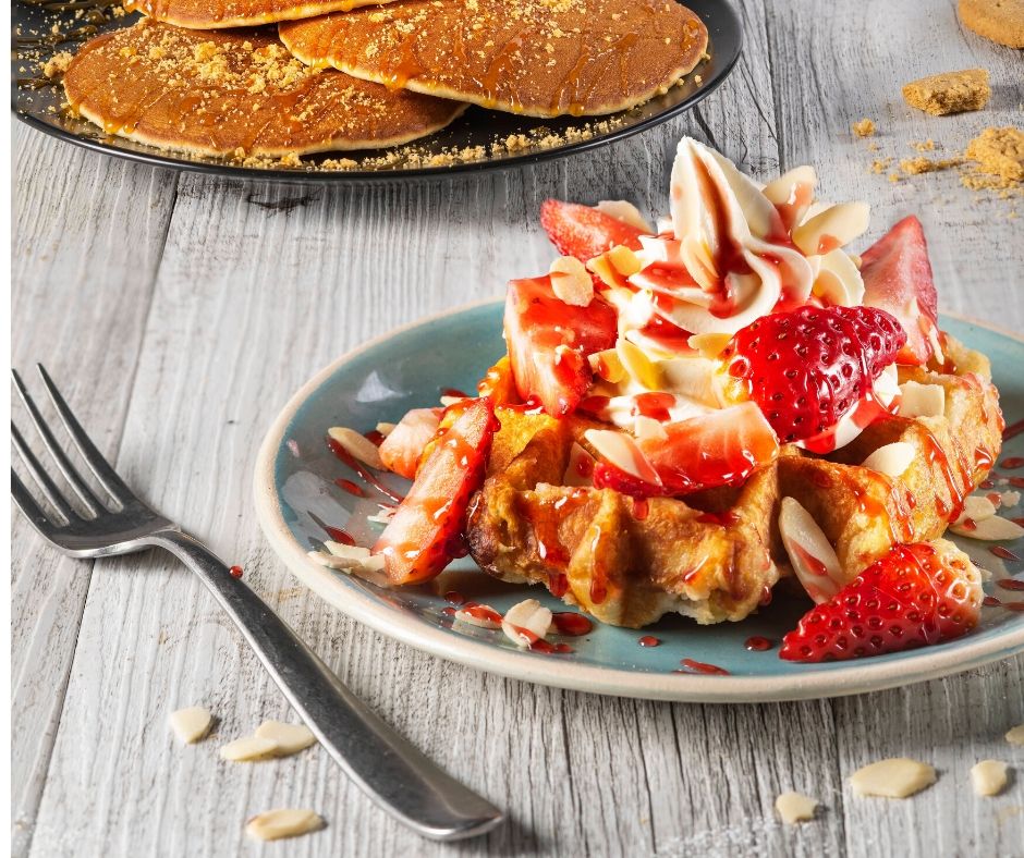 Irresistible gofre con fresas, nata, sirope de arce yalmendras.